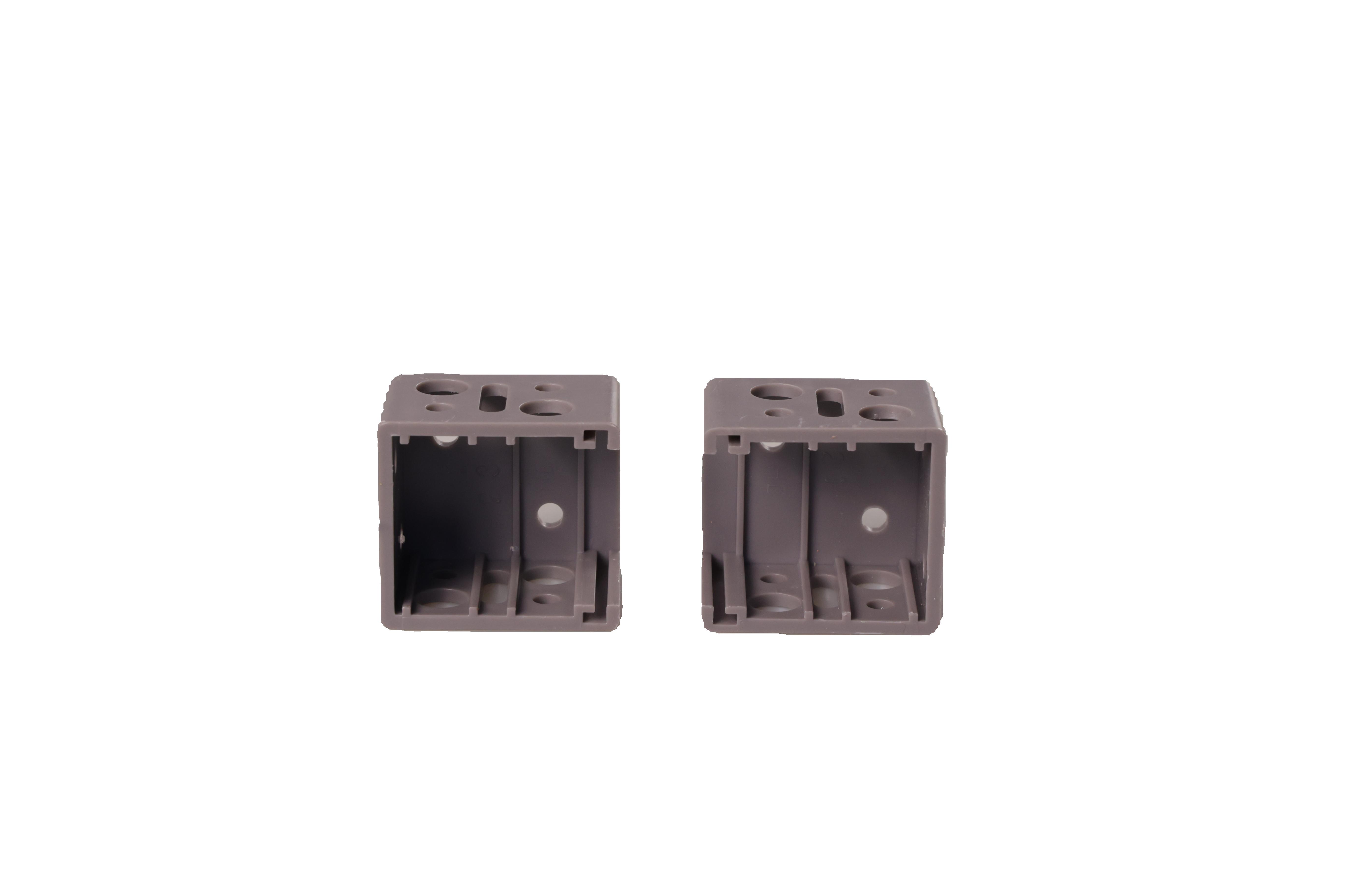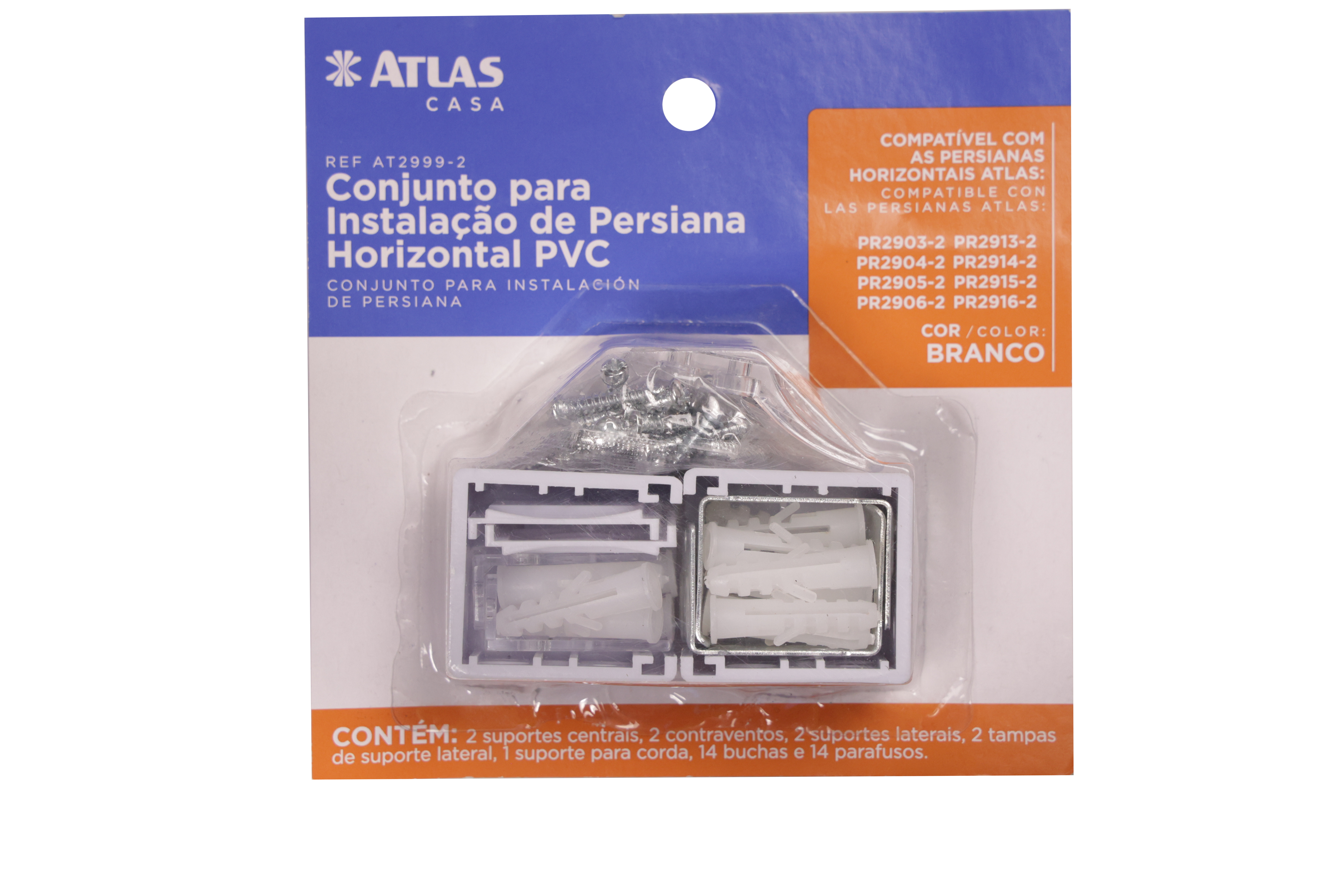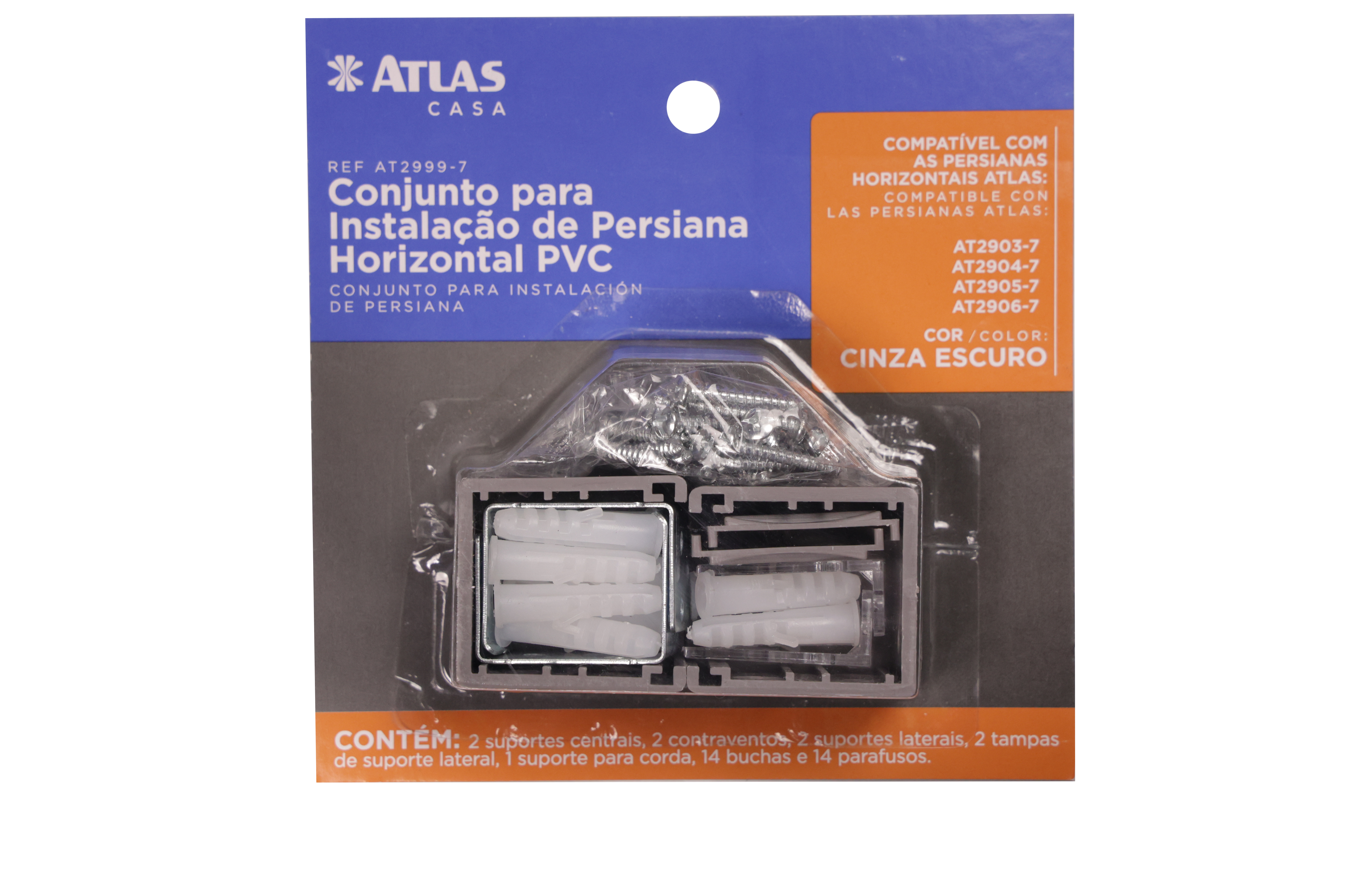 Kit de instalación para persiana horizontal. Compuesto por dos soportes centrales, dos contravientos, dos soportes laterales, dos tapas para los soportes laterales, un soporte para cuerda, taquetes y tornillos.