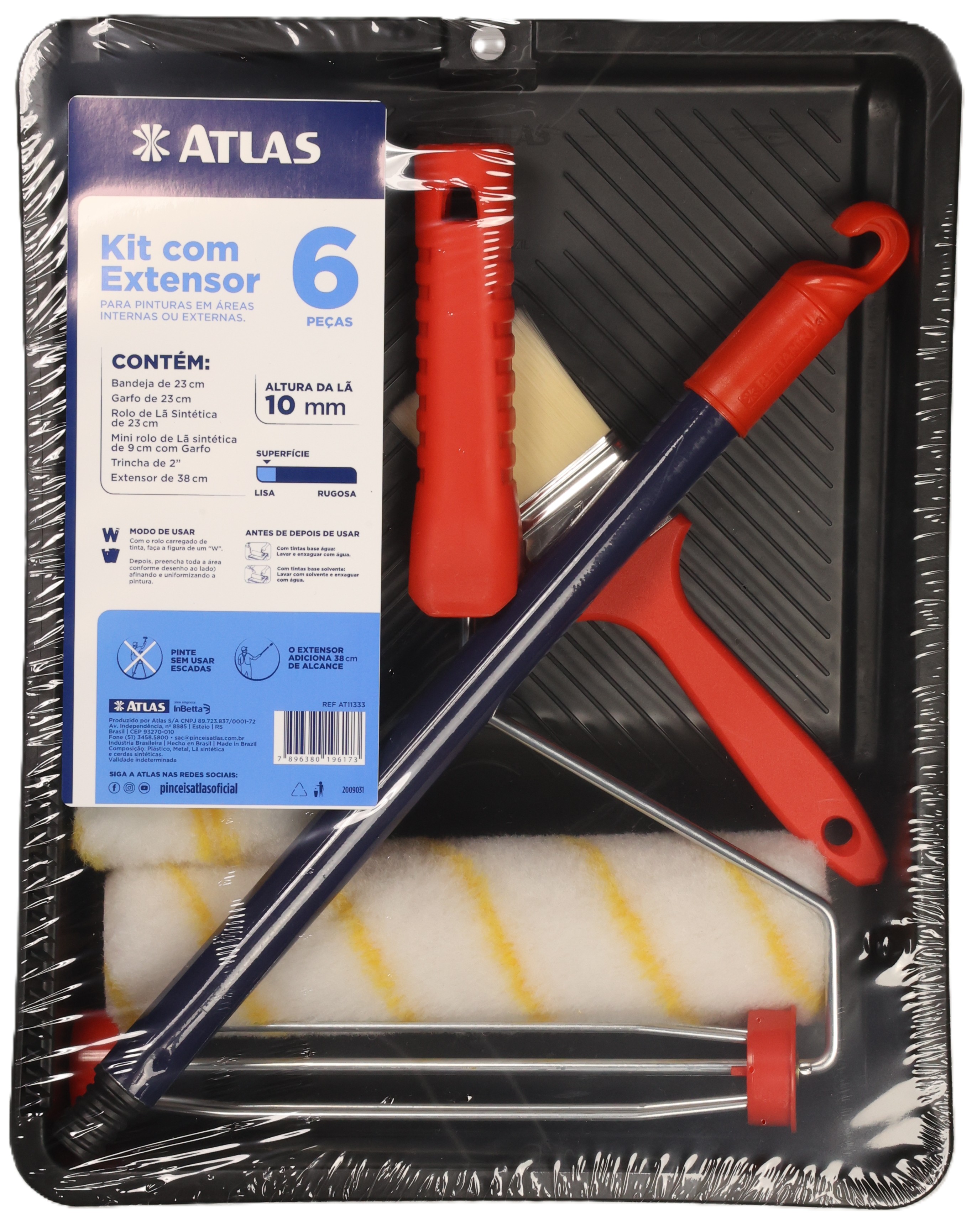 6-Piece Painting Kit includes: Paint tray (1523P), 2" flat brush (AT315/5), mini extension pole, 9 cm foam mini roller (AT773/9), cage roller frame (400/23SR), and 23 cm polyester roller (773/10).