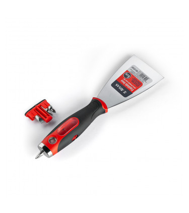 Espátula de Inox de 2.5” (CM) e 5” (CM) com cabo emborrachado. Acompanha armazenamento interno de bits contendo 2 chaves Philips e 2 bits fenda para facilitar o trabalho do profissional na montagem de construção a seco.