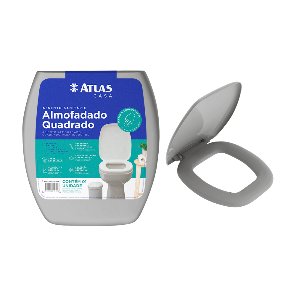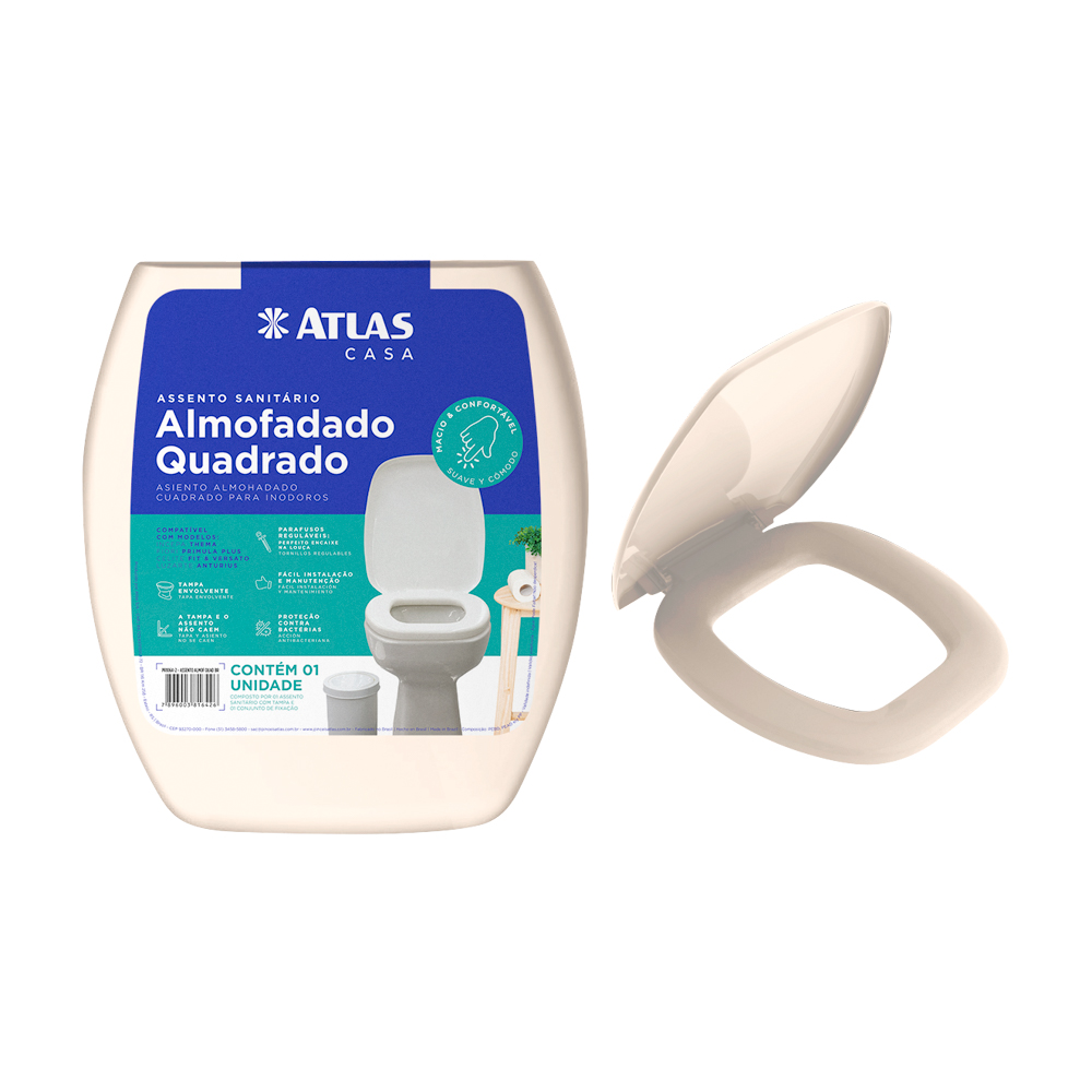 Assento sanitário almofadado. Acompanha kit para fixação. Preenchido com espuma de poliuretano (PU), ultramacio. Acabamento liso. Tampa envolvente. Suspiro na parte traseira. Fácil de instalar e limpar. Assento sanitário almofadado quadrado, compatível com as louças: Thema, Primula Plus, Versato, Cannes, Etna e Fit.