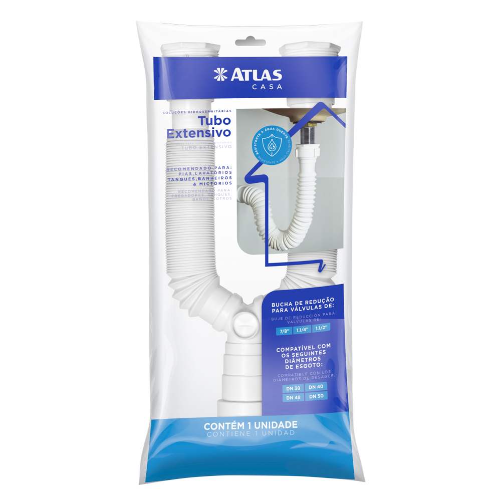 Tubo Extensivo duplo. Plástico (PP) e bucha (PVC). Evita mal cheiro e entrada de insetos. Bucha de redução para válvulas de 7/8”, 1. ¼”, 1. ½” atende a todos os padrões de saída de válvula. Compatível com os diâmetros de esgoto DN 38, DN 40, DN 48 e DN 50. Resistente à água quente até 90OC. Garantia contra vazamentos.