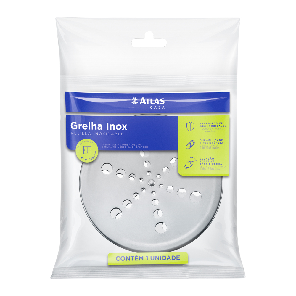 Grelhas com 15 x 15 cm. Fabricado em aço inox 430. Possui Mecanismo abre e fecha, que impede a entrada de insetos e evita o mau cheiro. Suporta até 120 Kg.