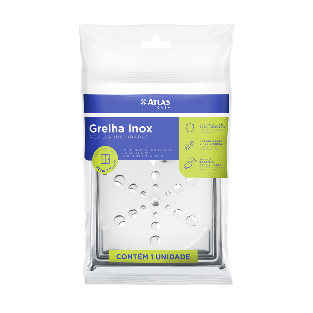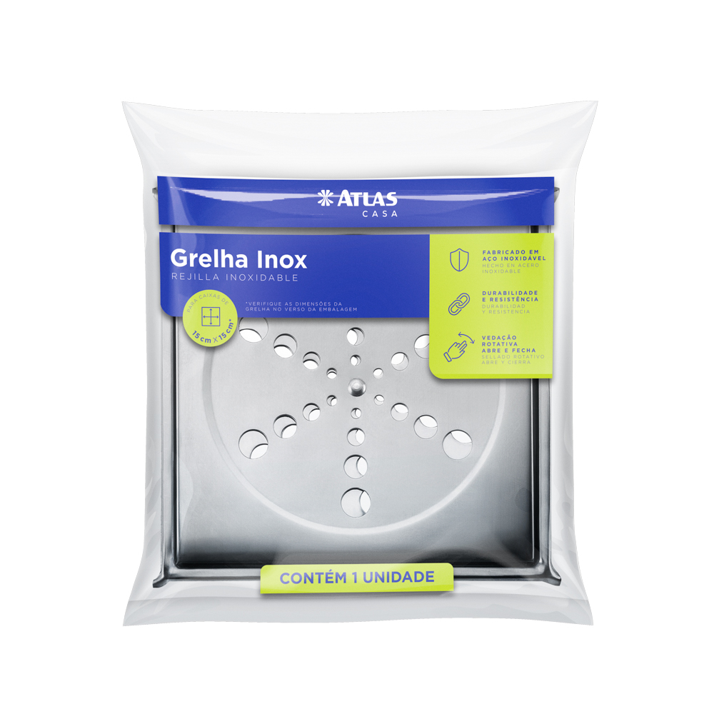 Grelhas com 15 x 15 cm. Fabricado em aço inox 430. Possui mecanismo abre e fecha que impede a entrada de insetos. Suporta até 120 Kg.