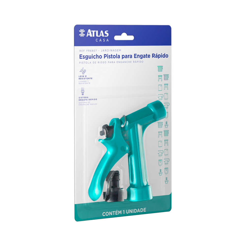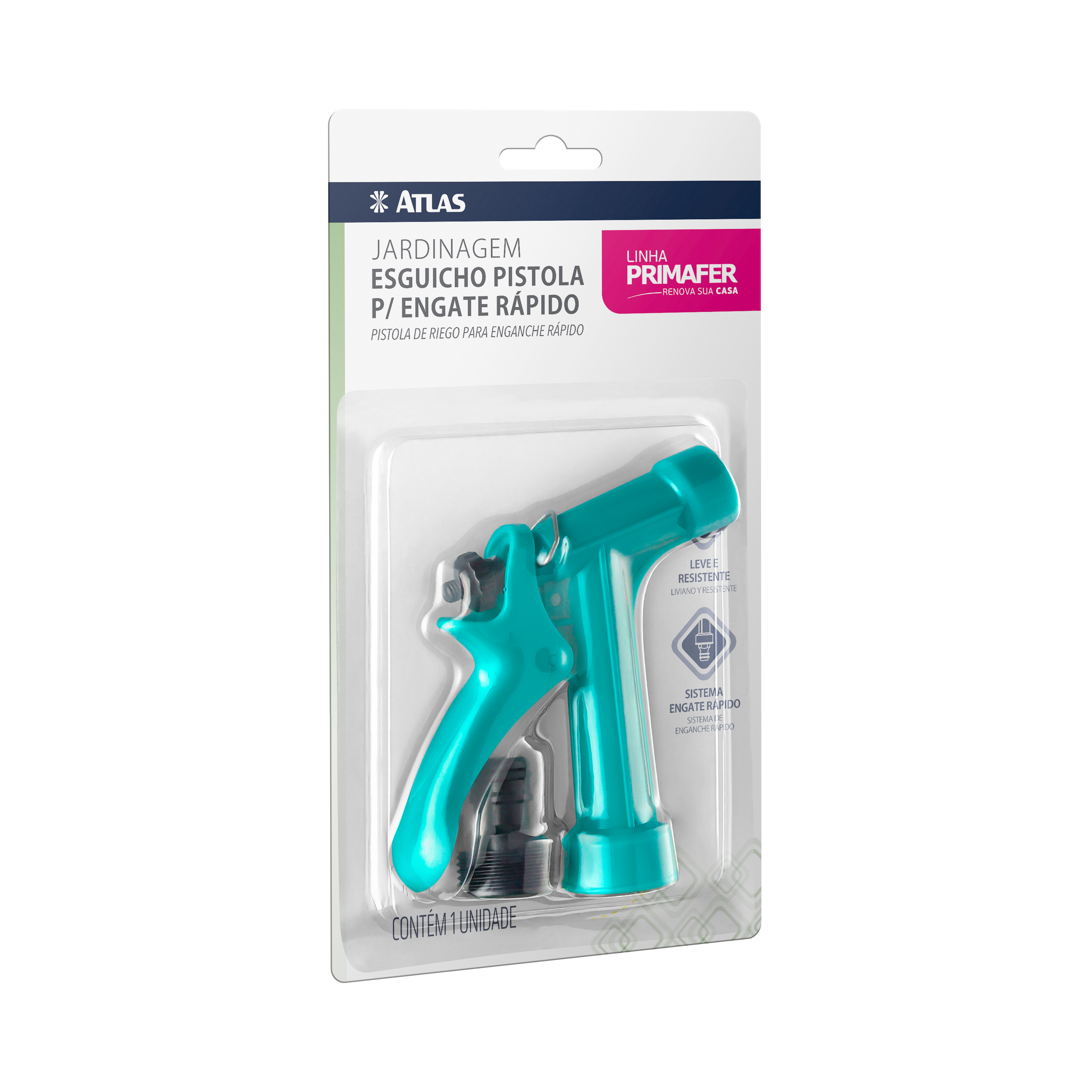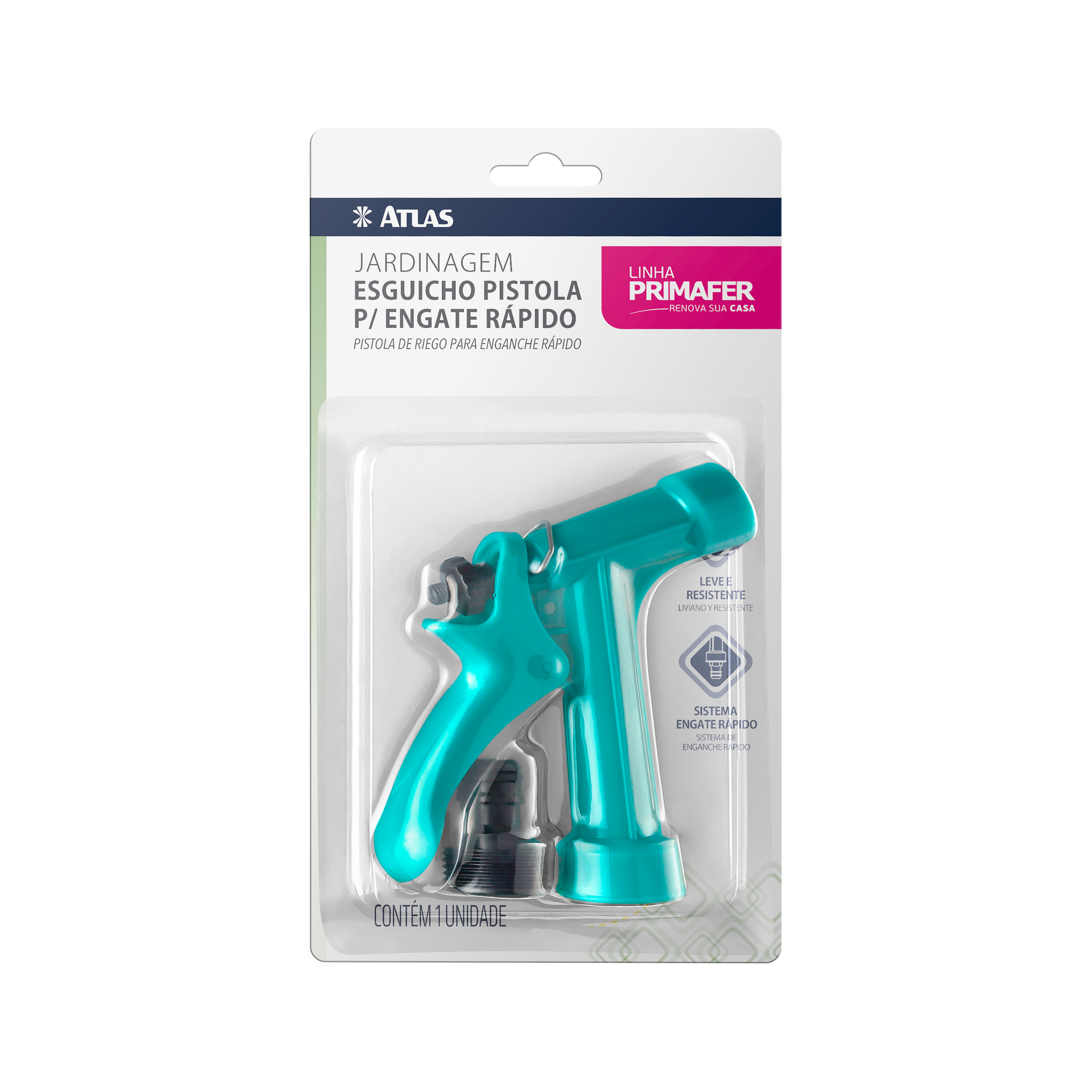 Esguicho pistola com gatilho que permite abrir, fechar e regular o fluxo d´água. Com trava para fácil manuseio do produto. Possui conexão tipo engate rápido. O esguicho pistola é utilizado para irrigar jardim, gramados ou hortas domésticas.