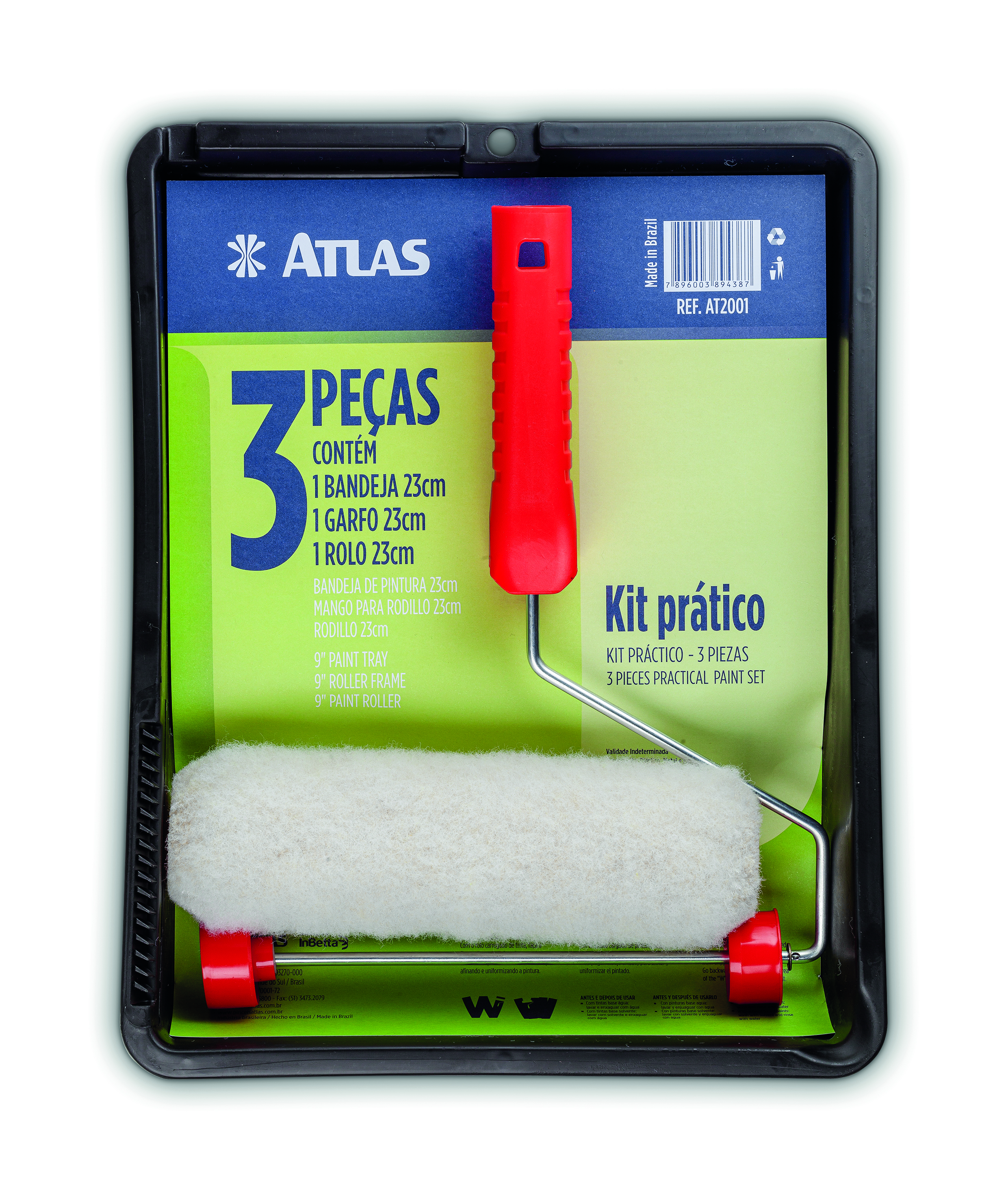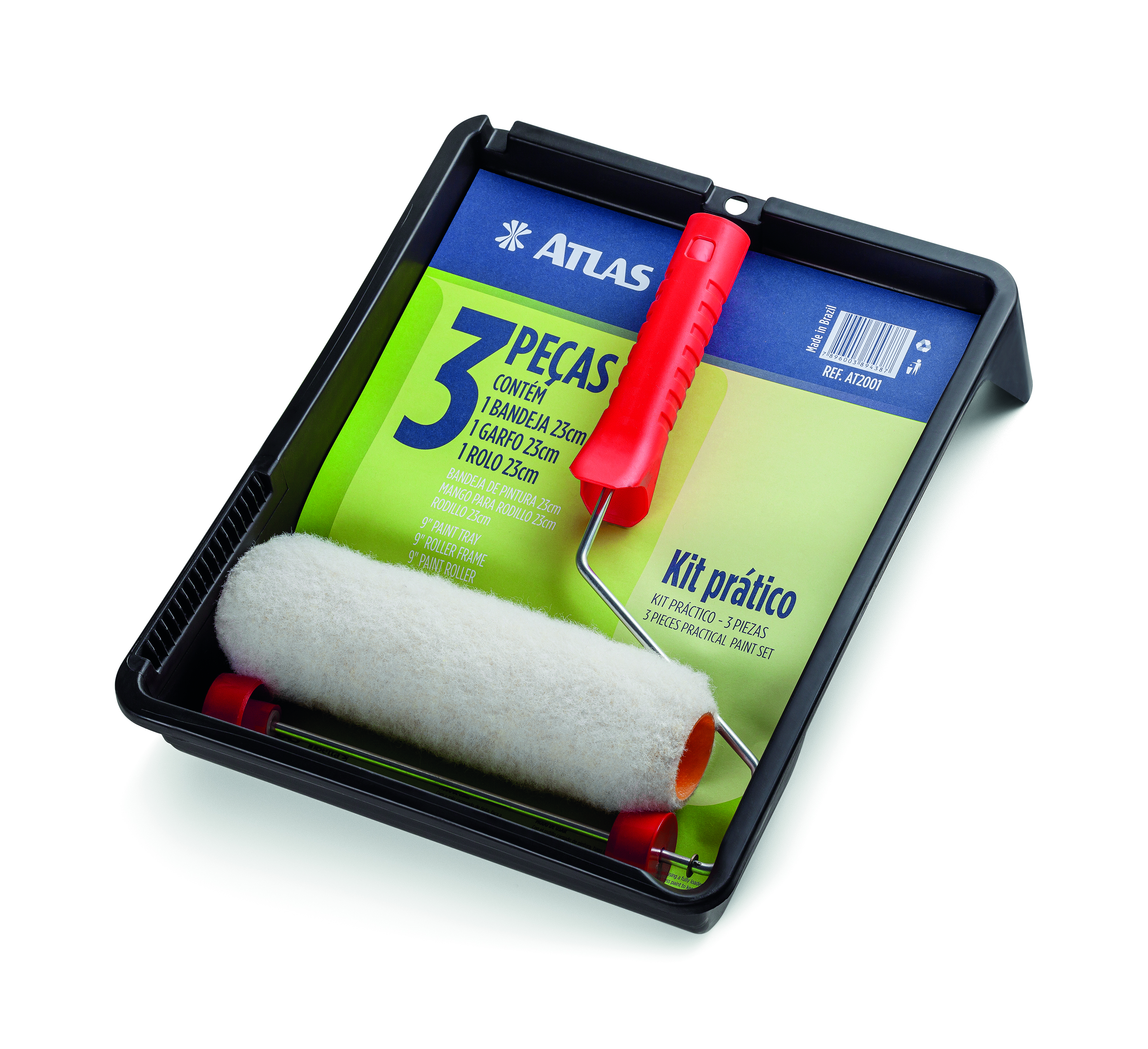 Kit 3 peças com bandeja, garfo e rolo de poliéster de 23cm. Ideal para pintura em superfícies lisas e semi rugosas. Use com tintas acrílica, látex (pva) e esmalte.