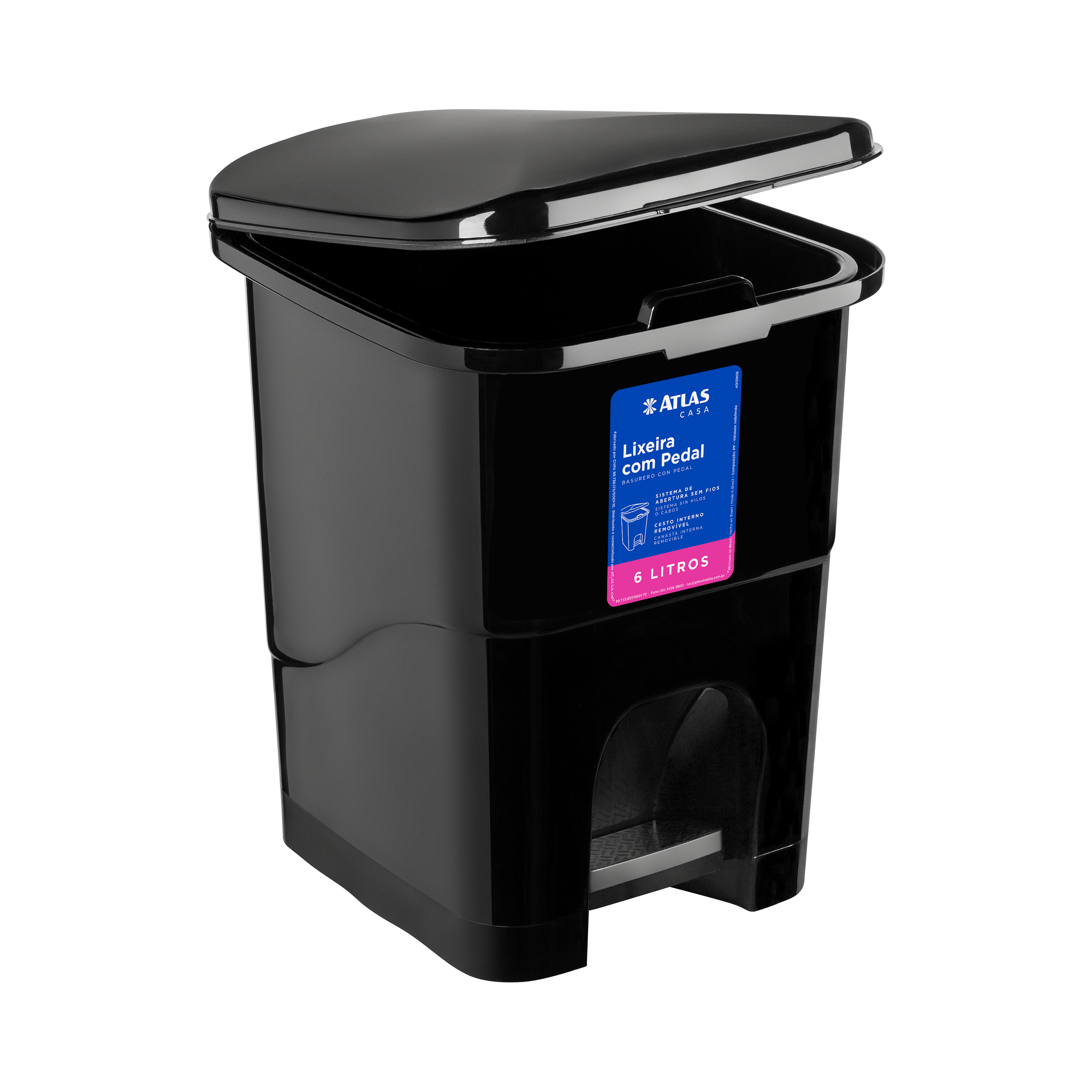 Retangular com pedal. Cesto removível para facilitar retirada do lixo. Resistente, prática e funcional. Fácil de lavar. Capacidade: 6 litros.